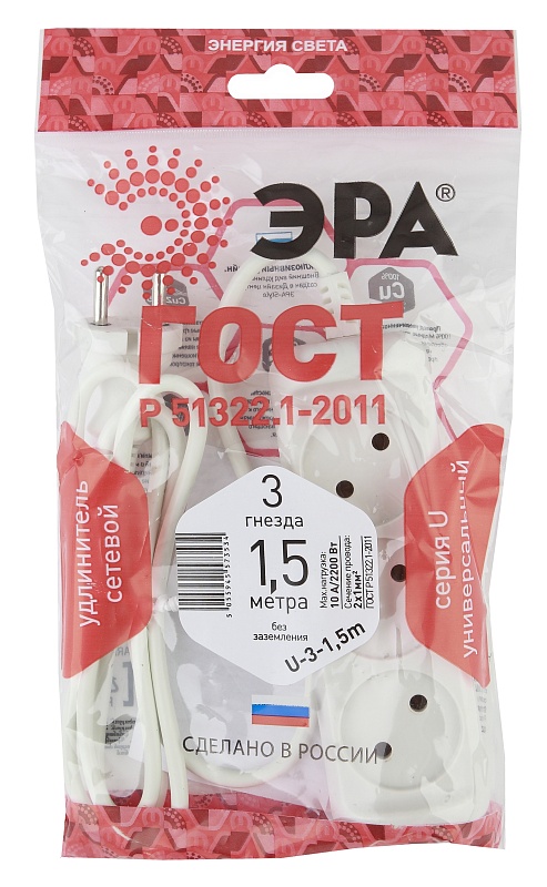 Удлинитель электрический ЭРА U-3-1,5m-2x1 без заземления 3 розетки 1,5м ПВС 2x1мм2 10ААртикул: 74559В наличии244 ₽
