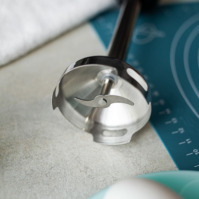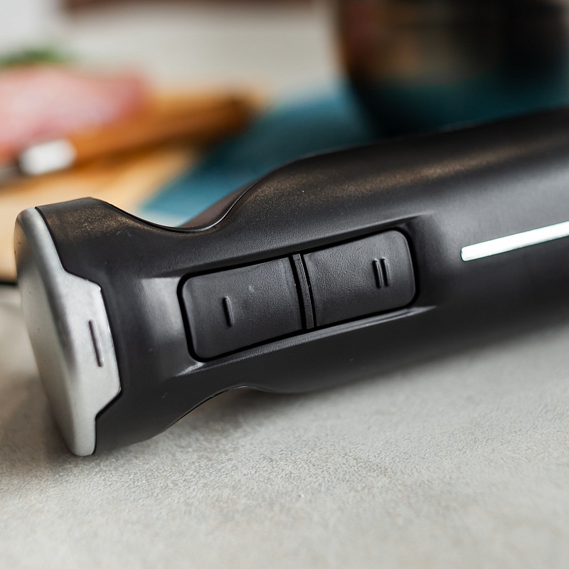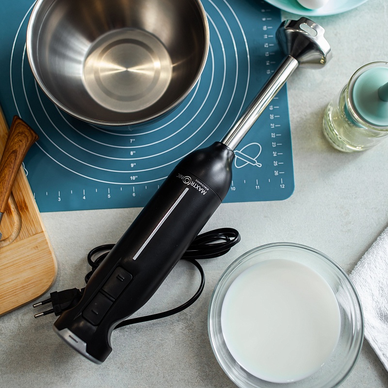 Надежный и удобный блендер поможет вам готовить ваши любимые блюда с минимальными затратами времени. Благодаря компактным размерам и простой конструкции блендер всегда будет под рукой и готов к работе. Идеально подходит для измельчения мяса, сыра, овощей, фруктов и трав, а также для взбивания сливок, соусов и смузи. Стильный дизайн идеально впишется в современный интерьер. В комплект входят: моторный блок с корпусом из матового черного ABS пластика с серебристыми вставками - это обеспечивает максимальный комфорт при работе с прибором, погружная часть с двойными ножами из нержавеющей стали.
