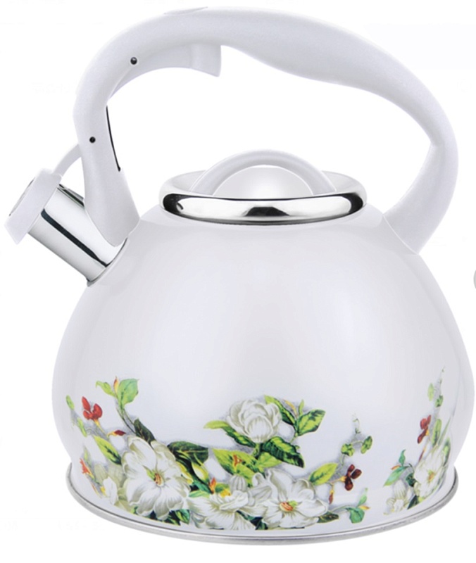 Чайник со свистком, 2,5л. Модель выполнена по специальной пресс-форме с толщиной боковых стенок 0,4мм. Трехслойное дно, выполненное по технологии капсулирования, не деформируется и служит для равномерного распределения тепла. Ненагревающаяся нейлоновая ручка с кнопкой для открывания носика. Безопасный и громкий свисток вовремя проинформирует, что вода закипела. Высокопрочное покрытие чайника сохраняет отличный внешний вид изделия намного дольше. Подходит для всех типов нагревательных поверхностей. Материал нержавеющая сталь.