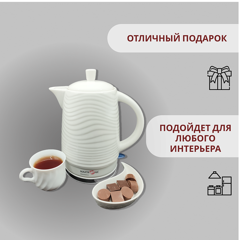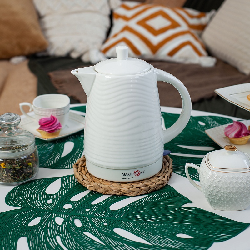 Керамический электрочайник на 1800 Вт имеет приятный внешний вид и станет прекрасным дополнением Вашего интерьера. Корпус чайника выполнен из керамики, что позволяет дольше удерживать тепло и реже его нагревать, что экономит электроэнергию. Модель поддерживает функцию автоматического выключения при отсутствии воды и при достижении водой температуры 100 градусов. Чайник может вращаться на подставке на 360 градусов, что позволяет ставить его с любой стороны, чтобы каждый член семьи мог полюбоваться минималистичным рельефом. Благодаря своей экологичности керамика гипоаллергенна, не выделяет налет и легко моется как внутри, так и снаружи. С керамическим чайником качество воды повысится, и любимые напитки станут чаще Вас радовать, а упаковка с пластиковой ручкой сделает его прекрасными подарком.