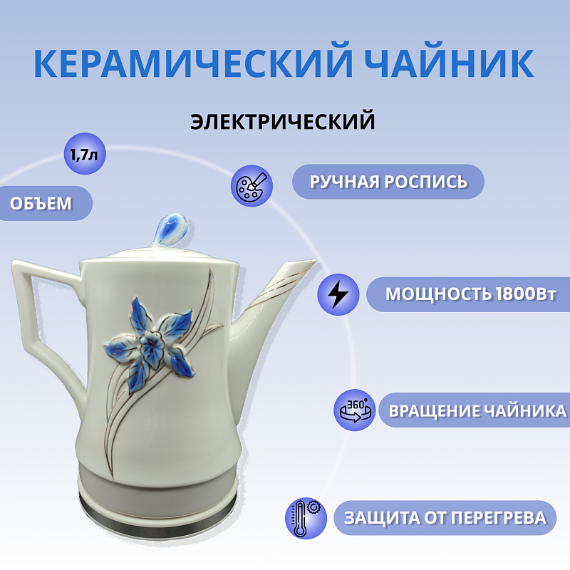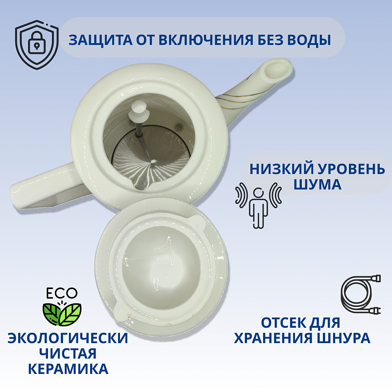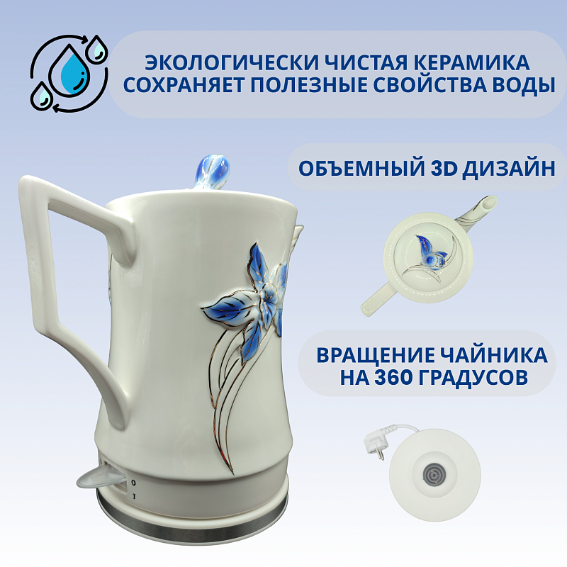 Керамический электрочайник на 1800 Вт имеет приятный внешний вид и станет прекрасным дополнением Вашего интерьера. Корпус чайника выполнен из керамики, что позволяет дольше удерживать тепло и реже его нагревать, что экономит электроэнергию. Модель поддерживает функцию автоматического выключения при ортсутствии воды и при достижении водой температуры 100 градусов. Чайник может вращаться на подставке на 360 градусов, что позволяет ставить его с любой стороны, чтобы каждый член семьи мог полюбоваться рельефной росписью. Благодаря своей экологичности керамика гипоаллергенна, не выделяет налет и легко моется как внутри, так и снаружи. С керамическим чайником качество воды повысится, и любимые напитки станут чаще Вас радовать, а упаковка с пластиковой ручкой сделает его прекрасными подарком.
