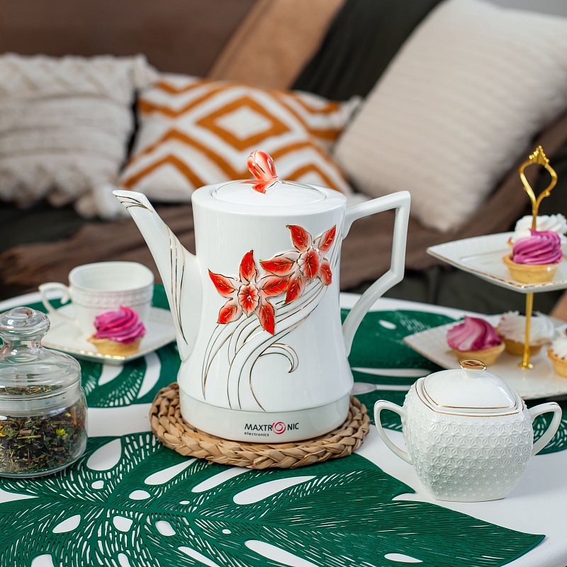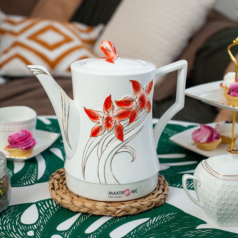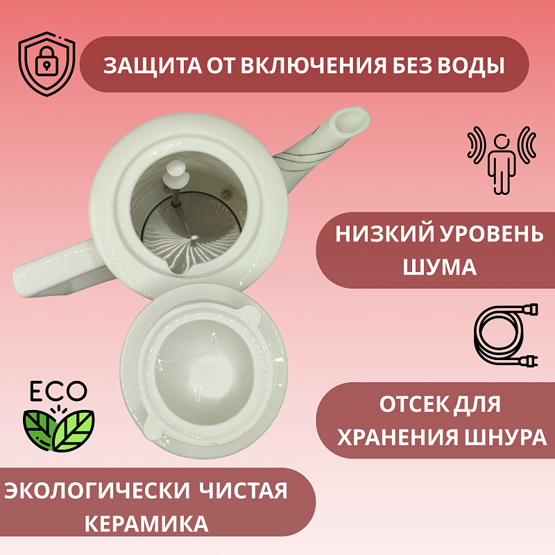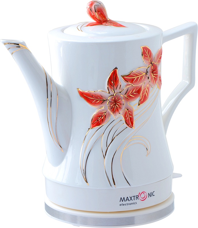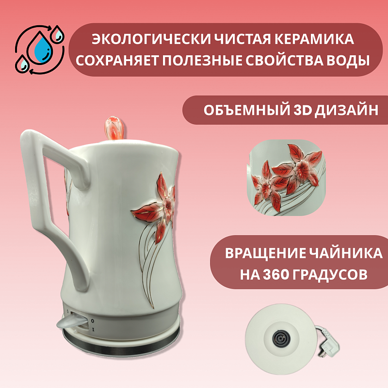 Керамический электрочайник на 1800 Вт имеет приятный внешний вид и станет прекрасным дополнением Вашего интерьера. Корпус чайника выполнен из керамики, что позволяет дольше удерживать тепло и реже его нагревать, что экономит электроэнергию. Модель поддерживает функцию автоматического выключения при ортсутствии воды и при достижении водой температуры 100 градусов. Чайник может вращаться на подставке на 360 градусов, что позволяет ставить его с любой стороны, чтобы каждый член семьи мог полюбоваться рельефной росписью. Благодаря своей экологичности керамика гипоаллергенна, не выделяет налет и легко моется как внутри, так и снаружи. С керамическим чайником качество воды повысится, и любимые напитки станут чаще Вас радовать, а упаковка с пластиковой ручкой сделает его прекрасными подарком.