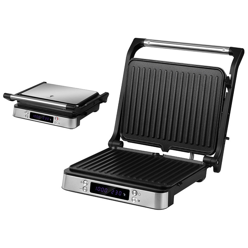 Мощность 2100Вт, LED-дисплей, размер панелей 29*23 см , сверхпрочное антипригарное покрытие Touch Pro5, режим Барбекю-раскрытие на 180 градусов
