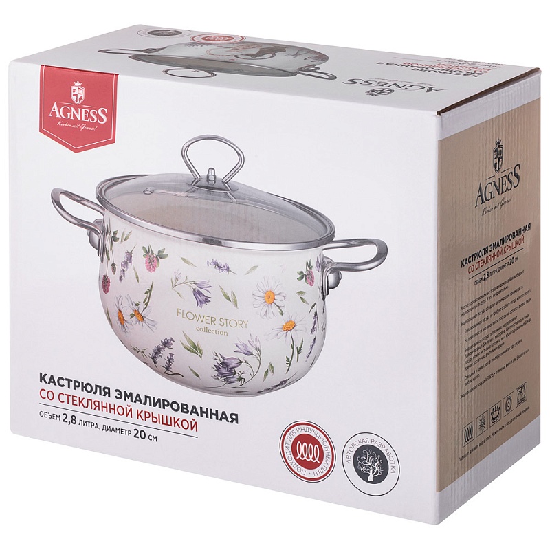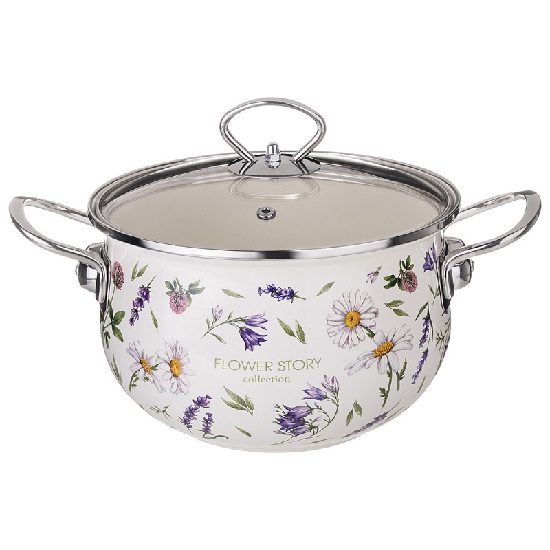 КАСТРЮЛЯ ЭМАЛИРОВАННАЯ СО СТЕКЛЯННОЙ КРЫШКОЙ СЕРИЯ FLOWER STORY 2,8 Л ДИА 20СМ 943-097 (6/1)