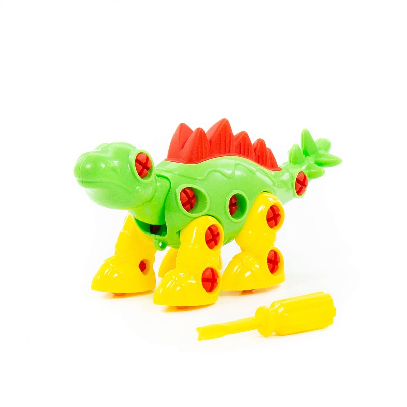 Игрушка выполнена в ярких цветах, из качественного материала, имеет округлую форму. Все элементы игрушки представлены в виде конструктора, который соединяется с помощью пластмассовых шурупов. В наборе также идёт крестообразная отвёртка, которая разнообразит игру, сделает её еще интереснее, позволяя без труда разбирать и собирать динозавра. Игра с таким конструктором знакомит ребёнка с первыми навыками моделирования и конструирования, а также развивает фантазию.