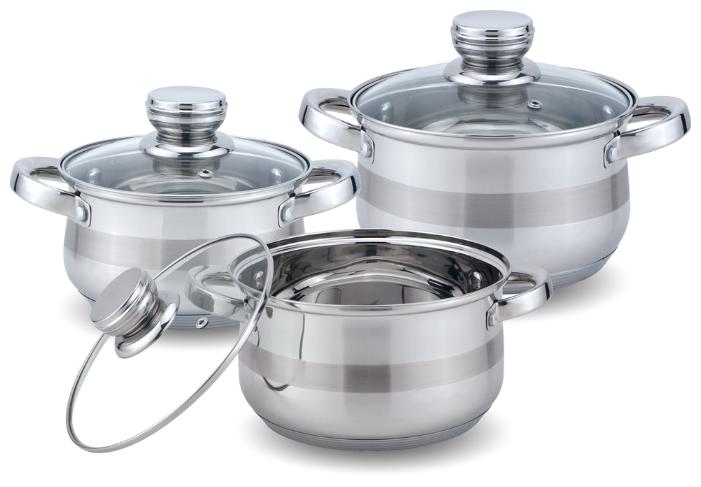 кастрюли 2,1л, 3л и 4л , внутри кастрюль шкала измерения, 5-слойное капсульное дно, можно использовать на всех типах плит включая индукционную, стеклянные крышки с паровыпуском