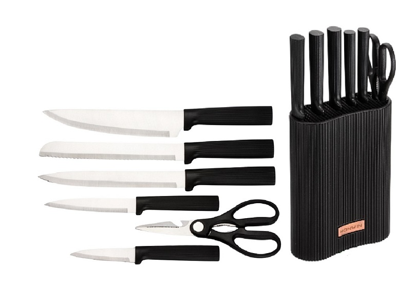 Нож кухонный - 1 шт., Нож для хлеба - 1 шт. ,Нож для нарезки - 1 шт., Нож универсальный - 1 шт., Нож для овощей - 1 шт., Ножницы - 1 шт. , Подставка - 1 шт.