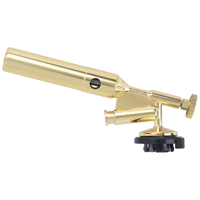 Портативная газовая горелка Форма горелки - пистолетная Вес нетто 95 гр, Размер изделия: 155*40*60мм, диаметр сопла: 19,91мм длина сопла 90 мм Тип соединения- цанговое Тип топлива - Пропан-бутановая смесь или изобутан Тип зажигания - пьезоподжиг Мощность: 4100BTU/1.2Квт Максимальная температура пламени - 1300°C Способ смешения газа - внутрисопловое Способ управления- вентиль Материал рукоятки -Цинк с золотым покрытием Материал сопла -Алюминий с золотым покрытием, медь, керамика, цинк, железо Цельнометаллическое исполнение, система предварительного подогрева газа