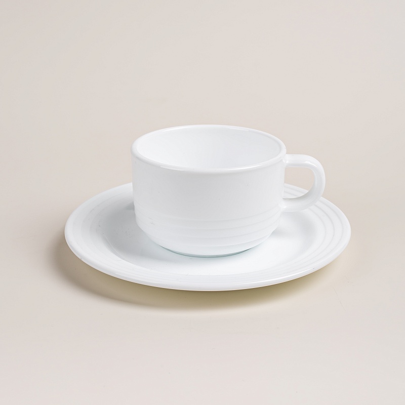 Чашка изготовлена из опалового упрочненного стекла, посуда из него одна из самых прочных и безопасных.