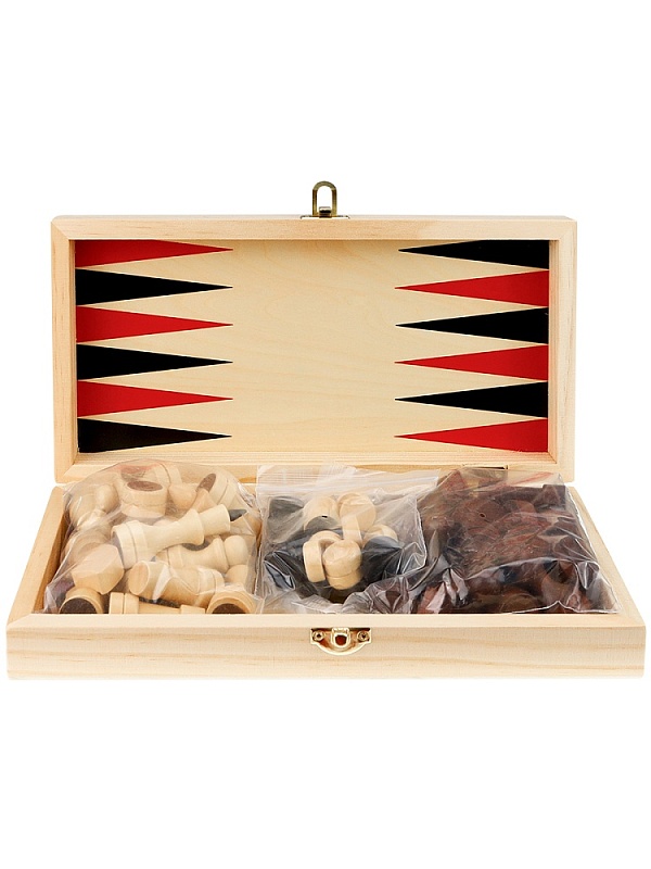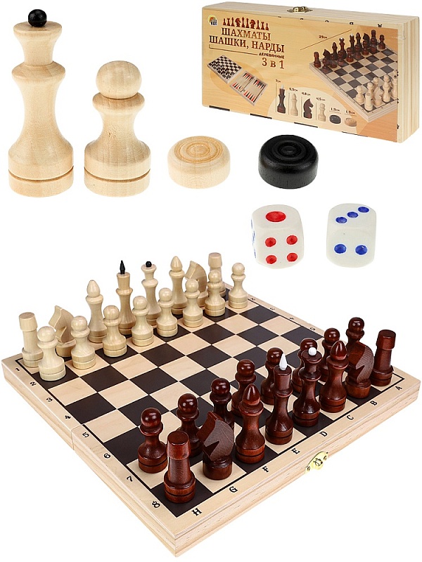 Классическая игра 3 в 1: шахматы, нарды, шашки. Шахматы -  настольная игра, предназначенная как для детей в возрасте от 6 лет, так и для взрослых. Подобные игры развивают у детей внимательность, наблюдательность, память, мелкую моторику рук и пальцев. Взрослым подобный игровой процесс помогает отвлечься от будней, сосредоточиться на решении непростых логических задач, развивает стратегическое мышление.  Игра в нарды также поспособствует развитию стратегического мышления и пространственного воображения, улучшит память и математические способности, научит концетрироваться. Шахматное поле и фигуры выполнены из дерева.