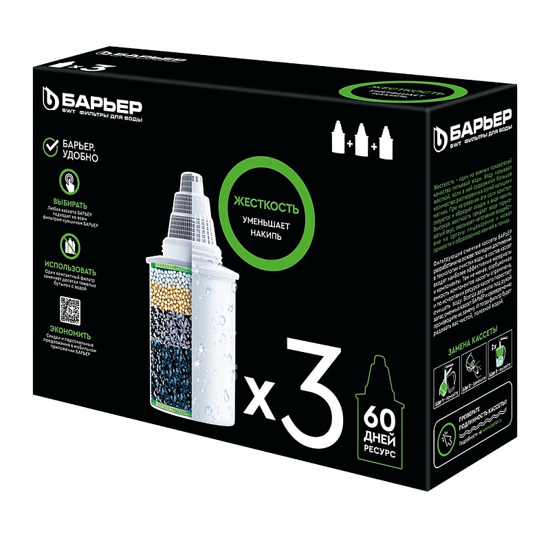 С помощью кассеты «Жесткость» происходит специальная очистка жесткой воды. Позволяет забыть о накипи в чайнике, удаляет хлор и его соединения, тяжелые металлы и другие вредные примеси. Ресурс очищаемой воды составляет не более 350 л (для одной кассеты). Срок эксплуатации — до 6 месяцев (1050 л). В упаковке — 3 штуки.