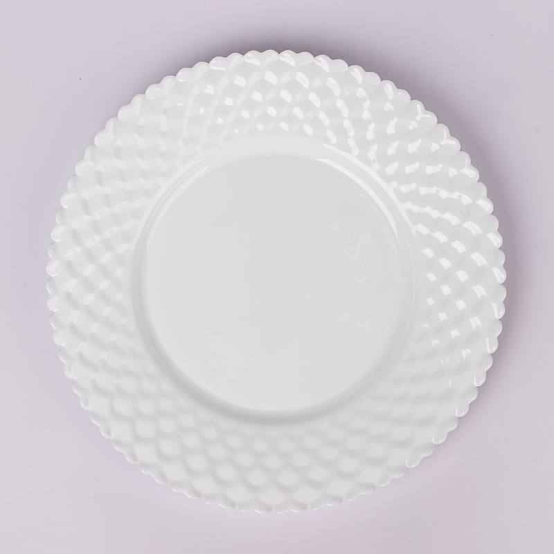Тарелка изготовлена из опалового стекла, посуда из него одна из самых прочных и безопасных.