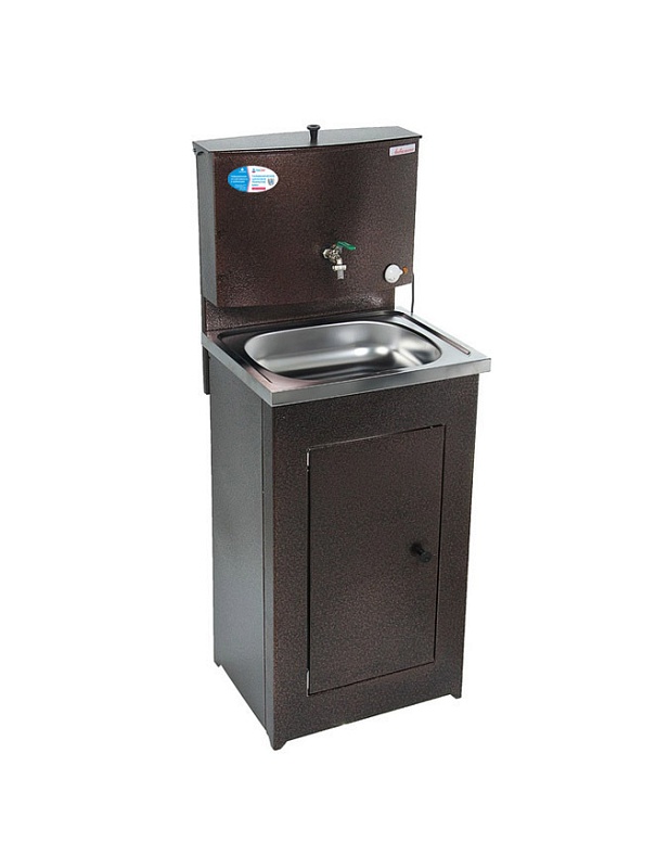 Умывальники «Акватекс» с габаритами 420х500х1260 мм приобретаются для дачи, гаража, мастерской или других мест без центрального водоснабжения. Металлическая конструкция цвета меди проста в эксплуатации и уходе, обладает высокой износоустойчивостью. Раковина с габаритами 400х500 мм выполнена из нержавеющей стали, а на бак для воды нанесено запатентованное устойчивое к коррозии покрытие. Номинальный объем бака — 17 л. Преимущества данной модели: