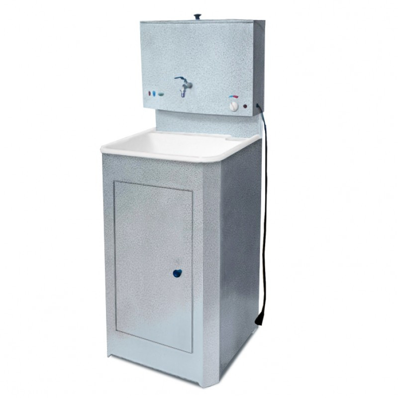 Умывальники «Акватекс» с габаритами 420х500х1260 мм приобретаются для дачи, гаража, мастерской или других мест без центрального водоснабжения. Умывальник выполнен из высококачественной стали и окрашен прочной краской. Раковина с габаритами 400х500 мм изготовлена из пластмассы. Конструкция умывальника сборная. Он состоит из тумбы, которая незаметно скрывает способ отлива воды и позволяет производить отвод воды даже в канализацию, и бака со специальным краном для экономии воды. Номинальный объем бака — 17 л. Особое преимущество — наличие встроенного водонагревателя (мощность нагрева — 1,25 кВт, время нагрева (до 60 градусов цельсия) — 30 мин., номинальное напряжение — 220 В), который будет особенно актуален в прохладную погоду. Данная модель отлично подходит как для гигиенических процедур, так и для хозяйственных целей.