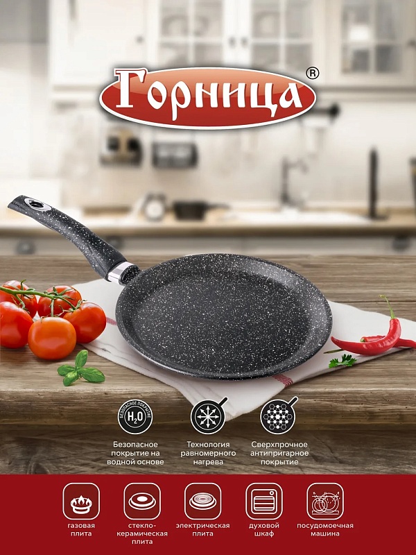 Литая алюминиевая блинная сковорода с антипригарным покрытием подходит для газовых, электрических и стеклокерамических плит. «Гранит».