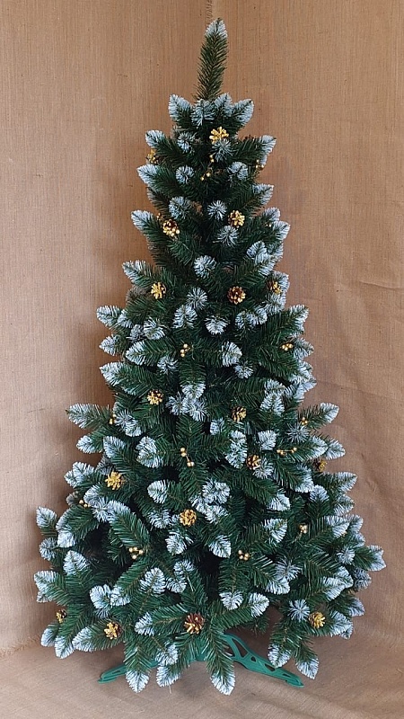 Ель «Кармен» высотой 180 сантиметров зеленого цвета на пластиковой опоре. Ее иголки изготовлены из пленки ПВХ. Кончики окрашены «под снег», имеет красивую острую коническую форму, расширяется к основанию, пышная. Добавлены шишки с позолотой и декоративные ягоды. Упакована в прочную коробку из картона, в которой можно хранить елку между праздниками.