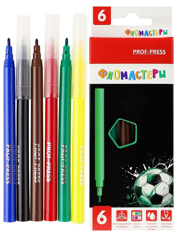Фломастеры — это друзья детства каждого ребенка! Они не только помогают развитию мелкой моторики, но и способствуют выражению своих эмоций через рисунок! Яркие насыщенные цвета и качество — всё, что нужно для красивого рисунка и хорошего настроения! Фломастеры от компании "Проф-Пресс" представлены в наборе из 6 цветов с вентилируемым колпачком. Продаются в картонной коробке.