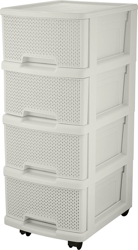Универсальный Комод-компакт Ajur с ящиками, который идеально подойдет для организации хранения в гостиной, ванной комнате, прихожей или кухне. Компактный размер позволяет удобно разместить комод в небольших помещениях. По ширине идеально подходит под формат бумаги А4. Спереди остается еще ~3 см для захвата стопки бумаги, и чтобы вынуть ее. Колесики для удобного перемещения комода во время уборки или перепланирования пространства. Уютный декор Ajur - ажурная фактура вязания будет прекрасным дополнением к другим изделиям из коллекции. Самое ажурное и легкое плетение в стиле вязания из всех, представленных на рынке.