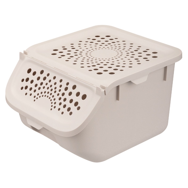 Линейка контейнеров для разных видов овощей представлена в двух объемах: 7,8 л и 11,3 л. Контейнеры можно ставить друг на друга в устойчивую стопку, оптимизируя полочное пространство на кухне, балконе или в кладовой. Крышка полностью снимается, что позволяет удобно наполнить контейнер. Многочисленные вентиляционные отверстия обеспечат естественную циркуляцию воздуха и отвод избытка влаги. Клапан крышки фиксируется в открытом положении не перекрывая доступ внутрь контейнера расположенного сверху. Производятся из безопасного пищевого полипропилена подлежащего вторичной переработке. Он экологичен и безопасен для человека, не впитывает запахи и легко моется.