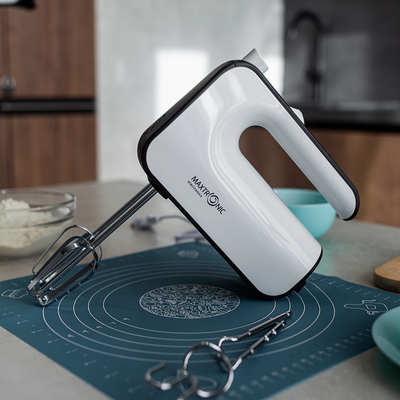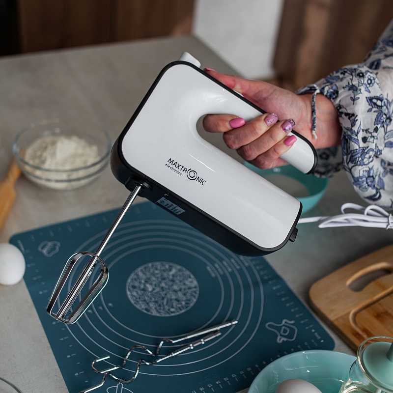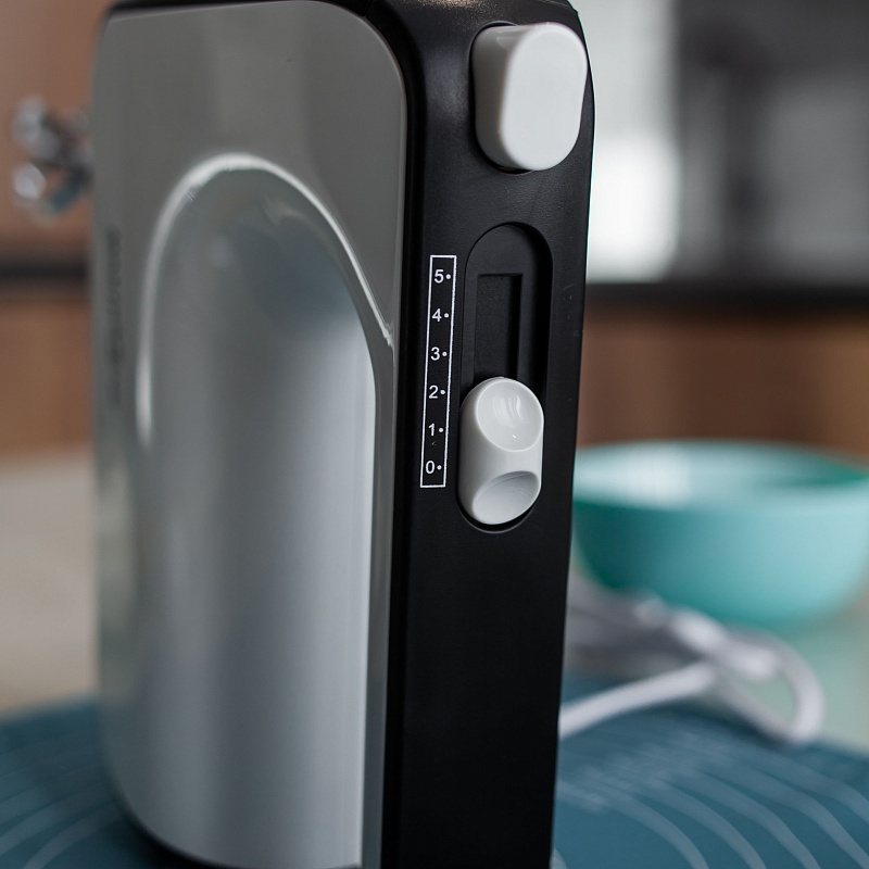2 вида насадок (крюки для замешивания теста и венчик для взбивания яиц и крема)
