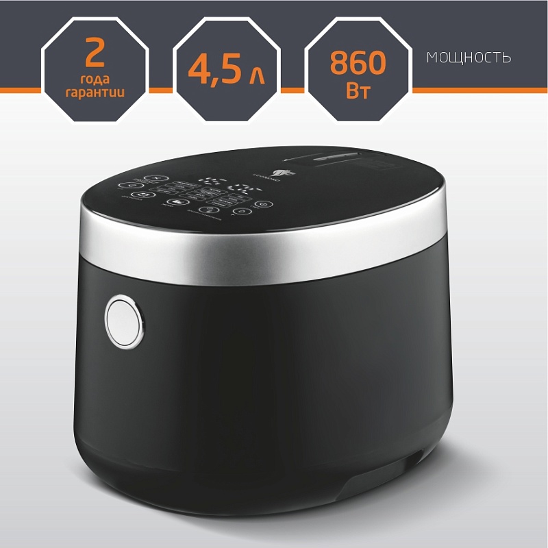 Мощность 860 Вт Обьем чаши 4,5 л Чаша с антипригарным покрытием Touch Pro 5 Пластиковый корпус Сенсорное управление LED дисплей 12 программ приготовления Датчик Precision Heat верхней и нижней температуры Съемная внутренняя крышка для удобной чистки Система защиты от перегрева Smart Protection В комплекте: контейнер-пароварка, мерный стакан, лопатка и ложка Длина шнура 120 см