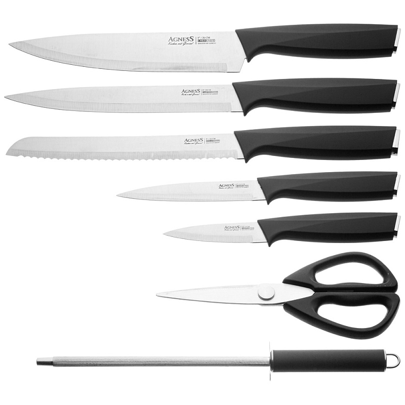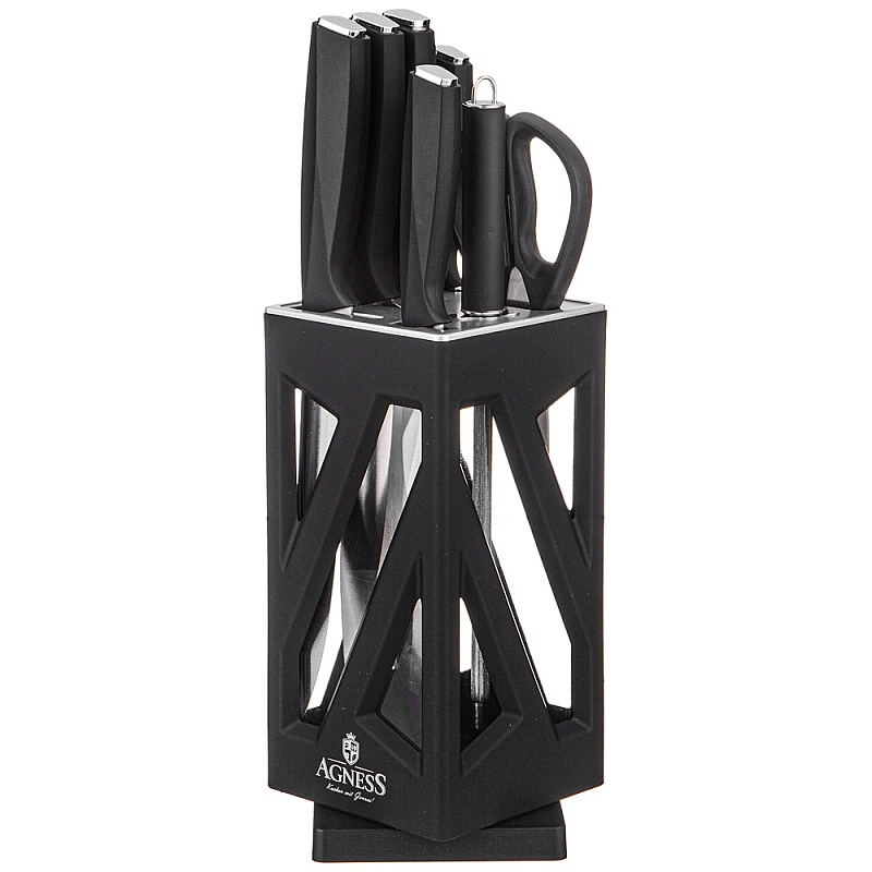 Состав набора: Нож поварской 20см, Нож для нарезки 20см, Нож для хлеба 20см, Нож универсальный 12,5см, Нож для чистки овощей и фруктов, 9см, Мусат, Ножницы для птицы, Вращающаяся подставка.