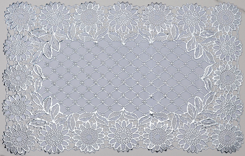 Салфетка для стола (30х46 см) кружевная с серебряным напылением Лэйс Лайт из ПВХ без основы (6 рисунков в ассортименте) удобна в эксплуатации и является хорошим вариантом для практичной хозяйки, ведь она не только защищает стол, но также выполняет декоративную функцию.