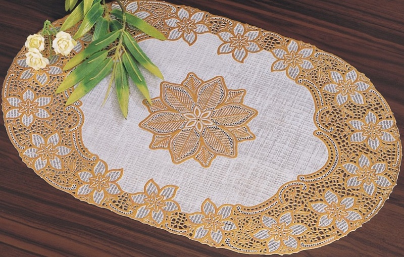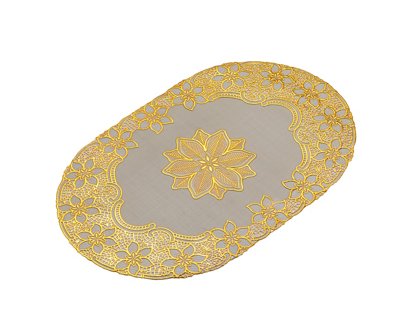 Салфетка для стола (30х46 см) кружевная с золотым напылением Лэйс Лайт из ПВХ без основы удобна в эксплуатации и является хорошим вариантом для практичной хозяйки, ведь она не только защищает стол, но также выполняет декоративную функцию.