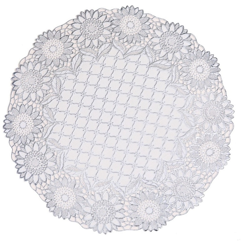 Салфетка для стола (38х38см) кружевная с перламутровым напылением Лэйс Лайт из ПВХ без основы (6 рисунков в ассортименте) удобна в эксплуатации и является хорошим вариантом для практичной хозяйки, ведь она не только защищает стол, но также выполняет декоративную функцию.