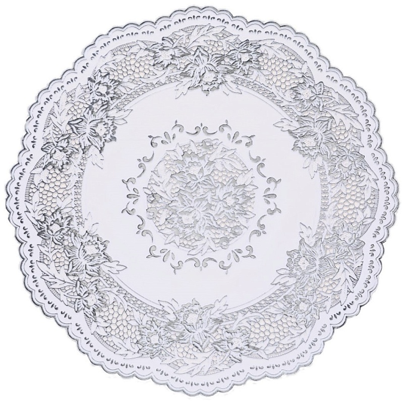 Салфетка для стола (38х38см) кружевная с серебряным напылением Лэйс Лайт из ПВХ без основы (6 рисунков в ассортименте) удобна в эксплуатации и является хорошим вариантом для практичной хозяйки, ведь она не только защищает стол, но также выполняет декоративную функцию.