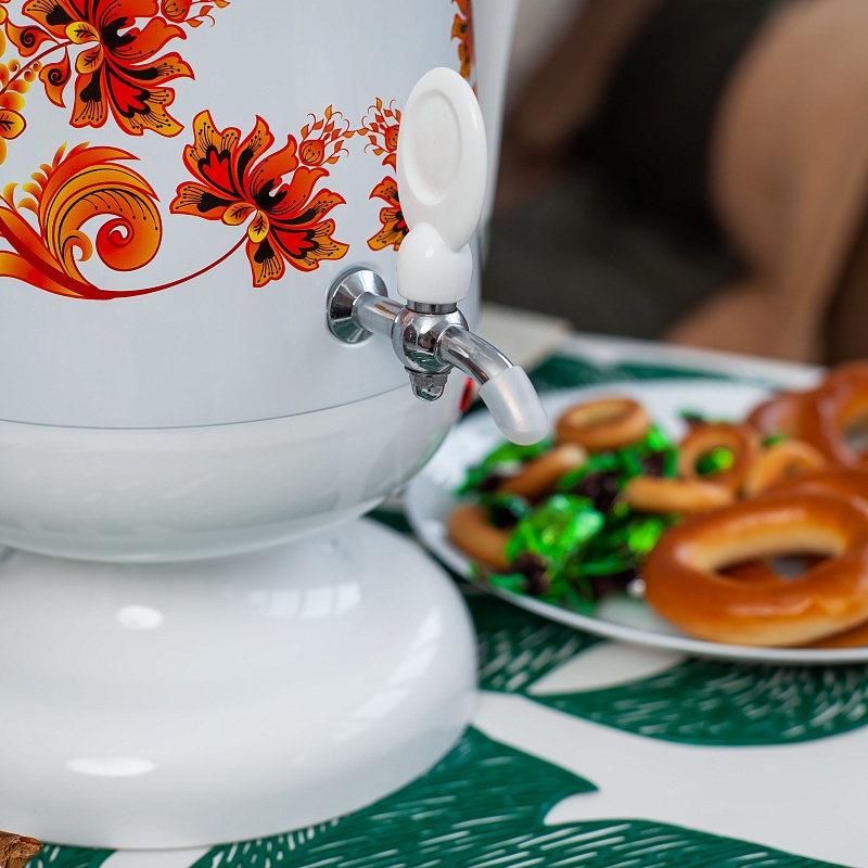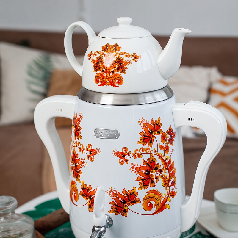 Электрический самовар в современном дизайне с росписью "Осень" добавит вашим чаепитиям атмосферу русских традиций и разнообразит интерьер кухни. Благодаря мощности 1800 Вт позволит быстро вскипятить до 3,5 л воды, чего хватит не только на всю семью, но и на гостей. Корпус чайника выполнен из керамики с колбой из нержавеющей стали, сверху установлен керамический заварочный чайник на 800 мл. Самовар оснащен функциями отключения при закипании, поддержания температуры и защитой от включения без воды. Легко моется, как внутри, так и снаружи.
