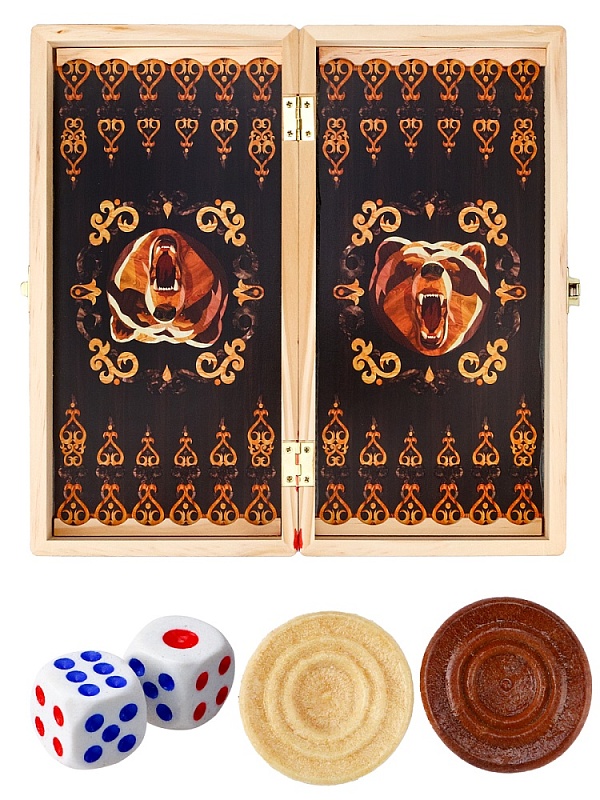 Нарды с медведем. Размер доски: 29 см, материал: дерево. Размер фишки:1,5 см, материал: дерево. В пакете.
