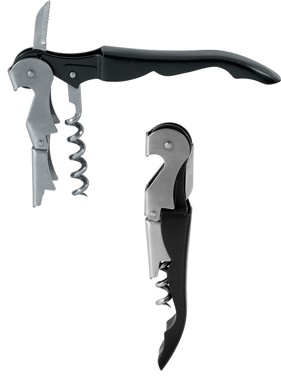 (Настоящие профессионалы сомелье предпочитают работать двухступенчатым ножом. Считается, что он более удобен, за счет того, что открывание бутылки происходит в два этапа. Сначала происходит сдвиг пробки, а затем уже ее извлечение. Двухступенчатый нож сомелье особенно актуален к использованию, если сомелье открывает очень старую бутылку вина, пробка в которой могла пересохнуть и быть очень хрупкой. Трудно открываются бутылки с вином, в которых пробка, наоборот слишком переувлажненная. В этом случае также, чтобы предупредить слом пробки, стоит воспользоваться двухступенчатым ножом сомелье.)